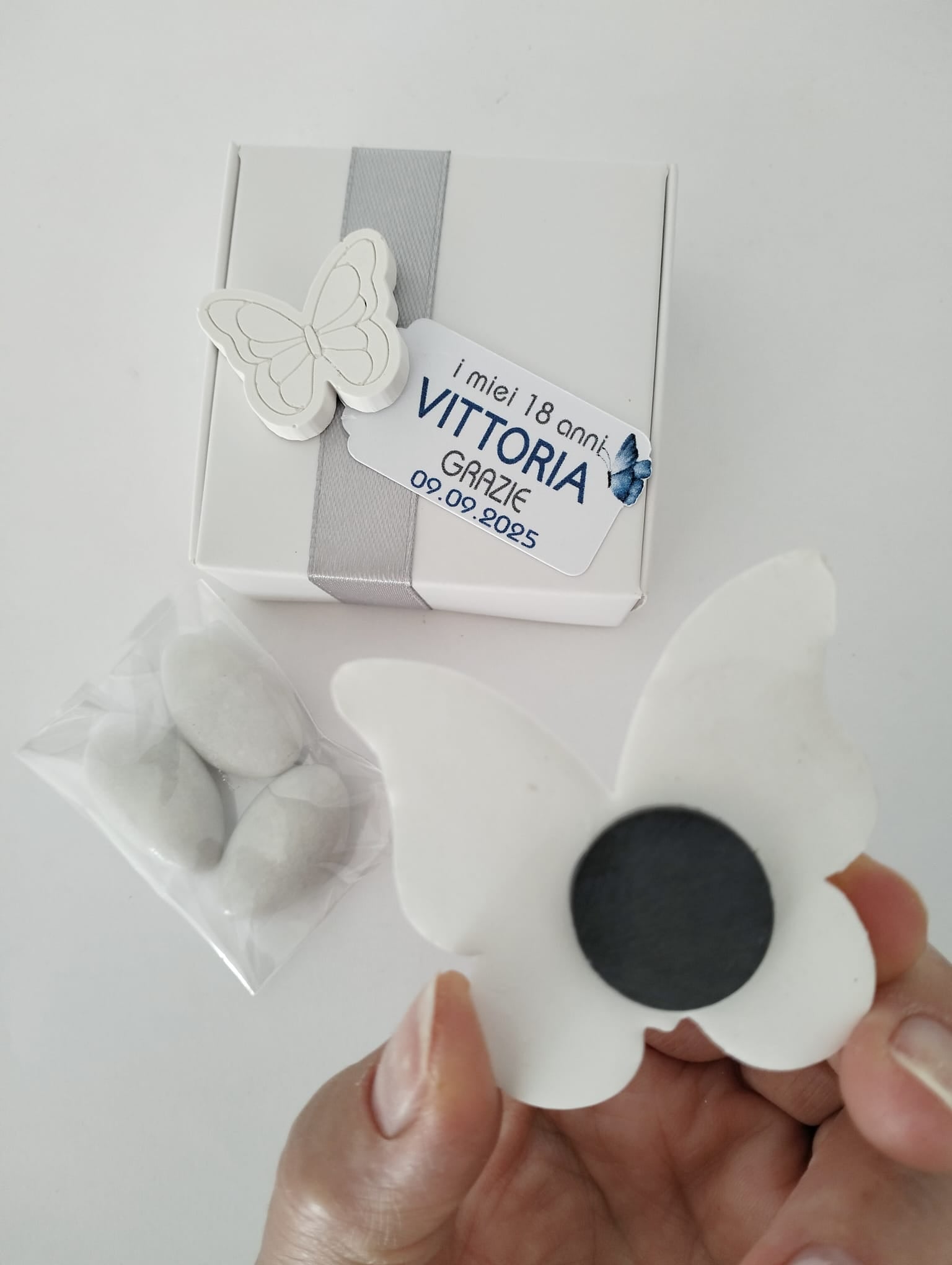 Queste bomboniere in polvere di ceramica a forma di farfalla rappresentano un'idea elegante e originale per comunioni, battesimi e diciottesimi. Perfette come calamite, sono arricchite da dettagli raffinati nei toni del blu e argento, personalizzate con frasi motivazionali che rendono unico ogni regalo. Realizzate a mano, uniscono artigianalità e stile per allestimenti compleanno eleganti, offrendo un ricordo speciale e significativo a un prezzo contenuto. Ideali per chi cerca bomboniere economiche ma di grande impatto estetico e simbolico.