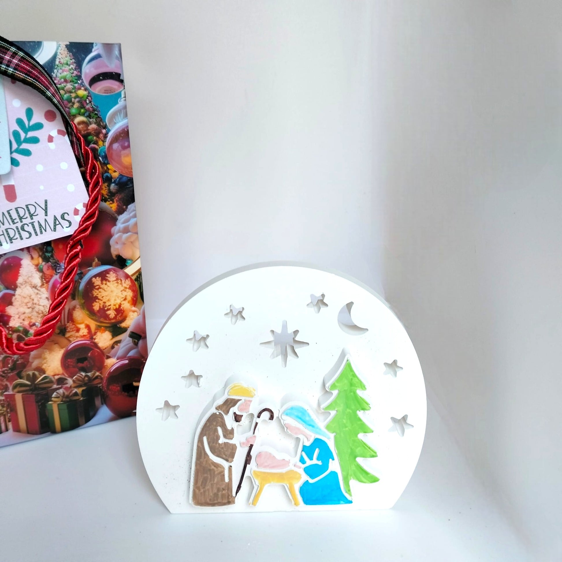 Un dono raffinato e pieno di significato. Sacra Famiglia in polvere di ceramica, dipinta a mano, perfetta da appoggiare come piccola decorazione natalizia.